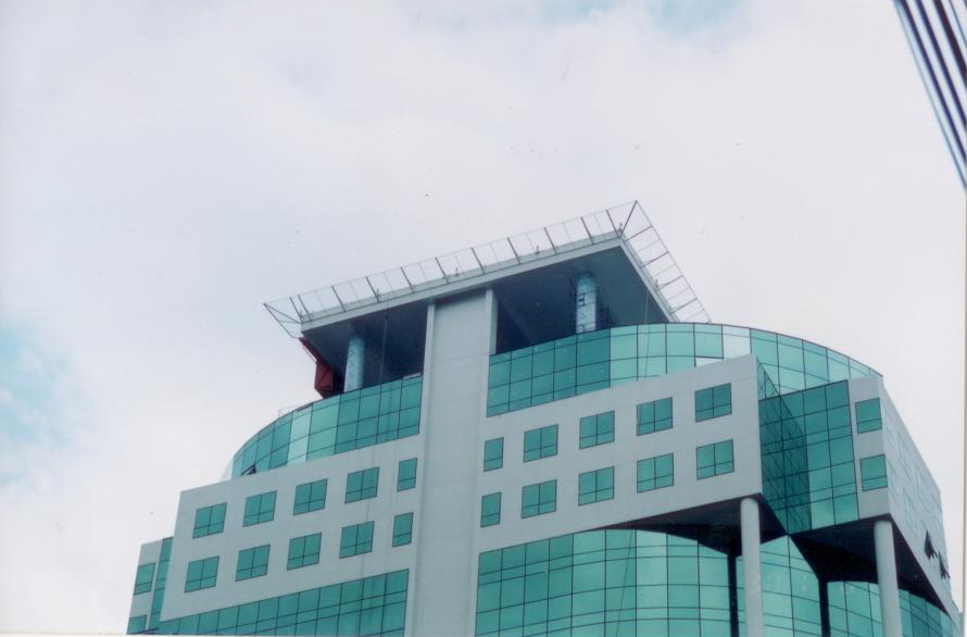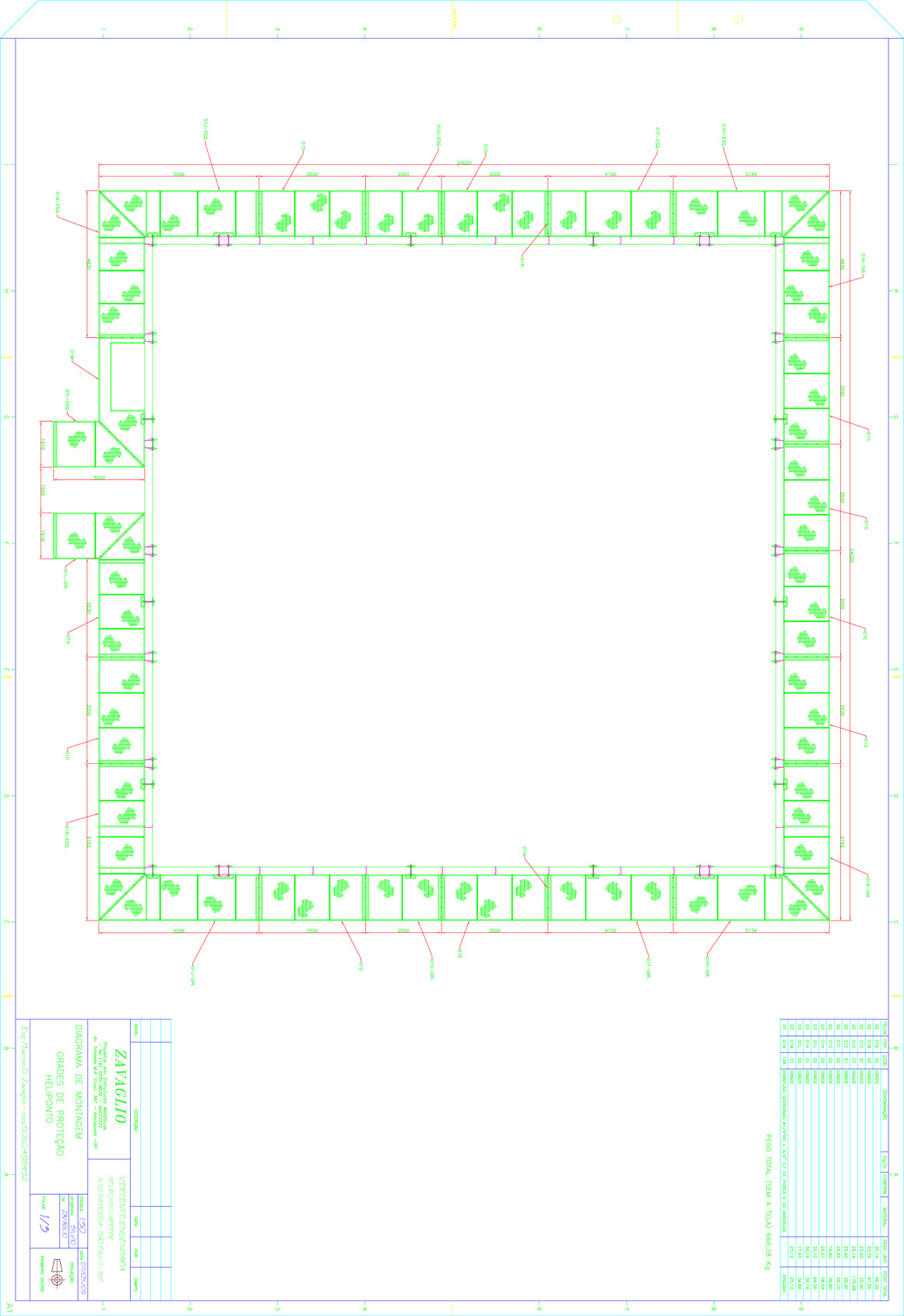 Heliponto elevado em estrutura metálica com piso metálico, escadas de acesso, caixa de incêndio e grade de proteção.
